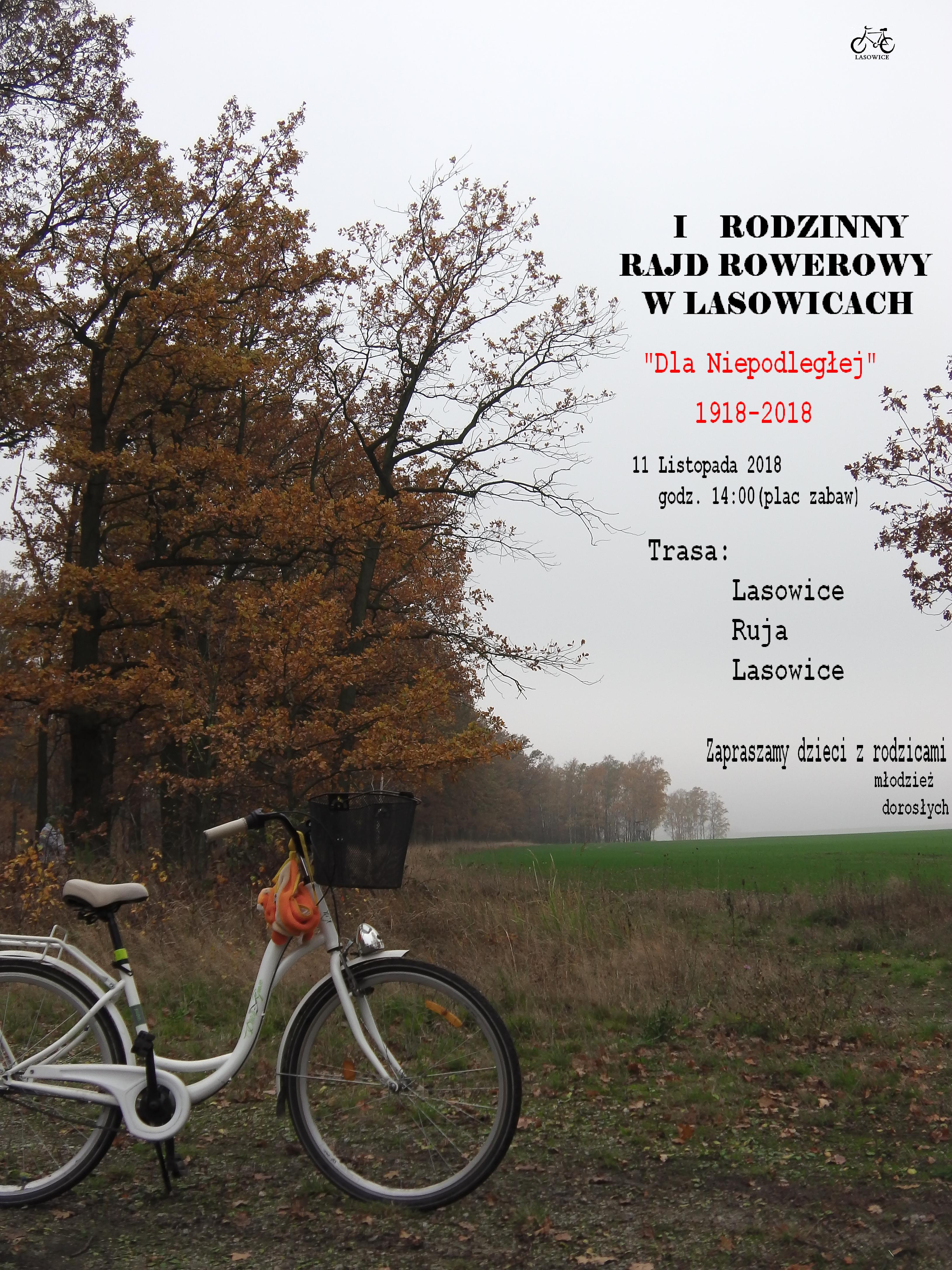 Zapraszamy wszystkich chętnych do udziału w I Rodzinnym Rajdzie Rowerowym z okazji 100-lecia Niepodległości, który odbędzie się dnia 11 listopada 2018 na trasie Lasowice-Ruja-Lasowice. Zbiórka o g. 14:00 przy placu zabaw w Lasowicach. Dzieci wyłącznie pod opieką rodziców lub opiekunów W celach organizacyjnych prosimy o potwierdzenie udziału w Rajdzie pod nr tel. 697 400 427 –