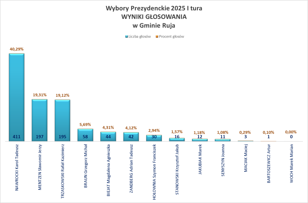 - Gmina Ruja – Nawrocki: 732 głosy (66,91%), Trzaskowski: 362 głosy (33,09%)